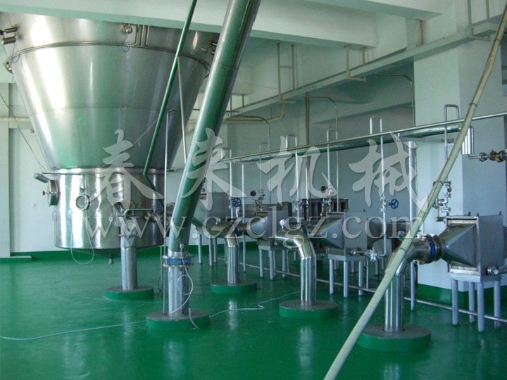 中藥浸膏高速離心噴霧裝置是離心式噴霧干燥技術在特定物料干燥中的應用 ,也是利用高速離心式霧化器使物料分散成霧狀,與熱空氣所充分接觸 ,完成瞬間